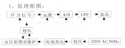 a壓力:被測(cè)介質(zhì)從引壓管施加壓力于固態(tài)(硅膜片)傳感器上,當(dāng)壓力變化時(shí),擴(kuò)散硅膜片的電阻地壓力電阻效應(yīng)下發(fā)生變化,這個(gè)變化作為電信號(hào)被檢測(cè)出來,通過線路將其轉(zhuǎn)換為與壓力成比例關(guān)系的電壓信號(hào),該信號(hào)經(jīng)模擬——數(shù)字轉(zhuǎn)換器轉(zhuǎn)換為數(shù)字信號(hào),經(jīng)微處理器處理后,在LCD顯示器上顯示出被檢介質(zhì)壓力值的數(shù)字。
